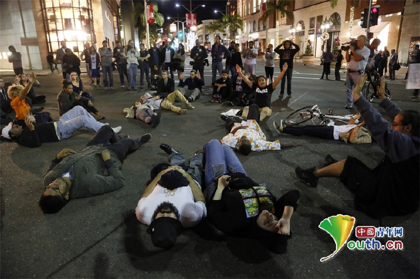 | In Beverly Hills (Los Angeles) legen sich die Demonstranten auf die Stra?e, um ihre Wut über den Entscheid der Grand Jury zu zeigen. |