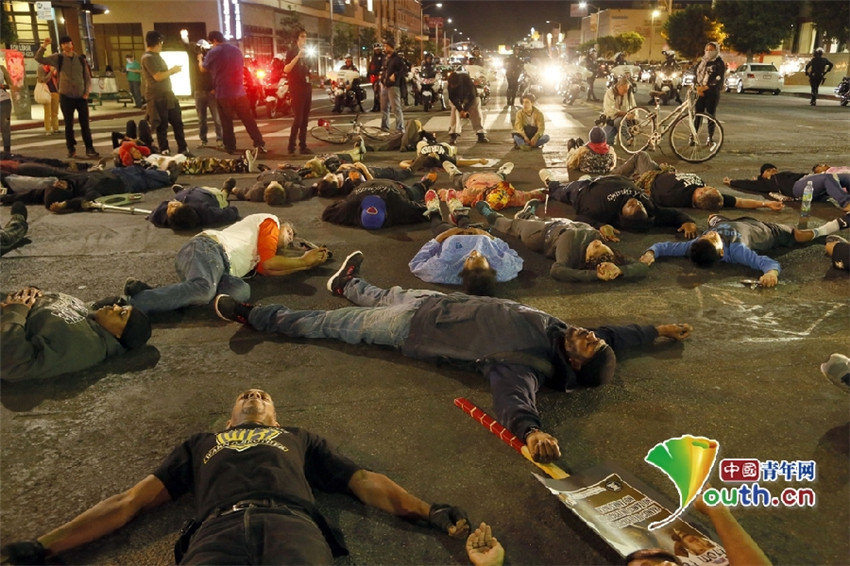 | In Beverly Hills (Los Angeles) legen sich die Demonstranten auf die Stra?e, um ihre Wut über den Entscheid der Grand Jury zu zeigen. |