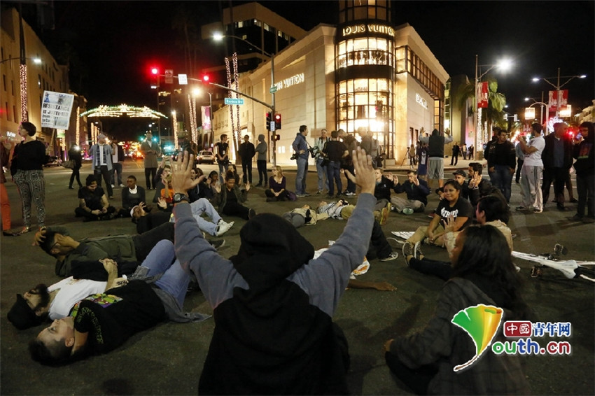 | In Beverly Hills (Los Angeles) legen sich die Demonstranten auf die Stra?e, um ihre Wut über den Entscheid der Grand Jury zu zeigen. |